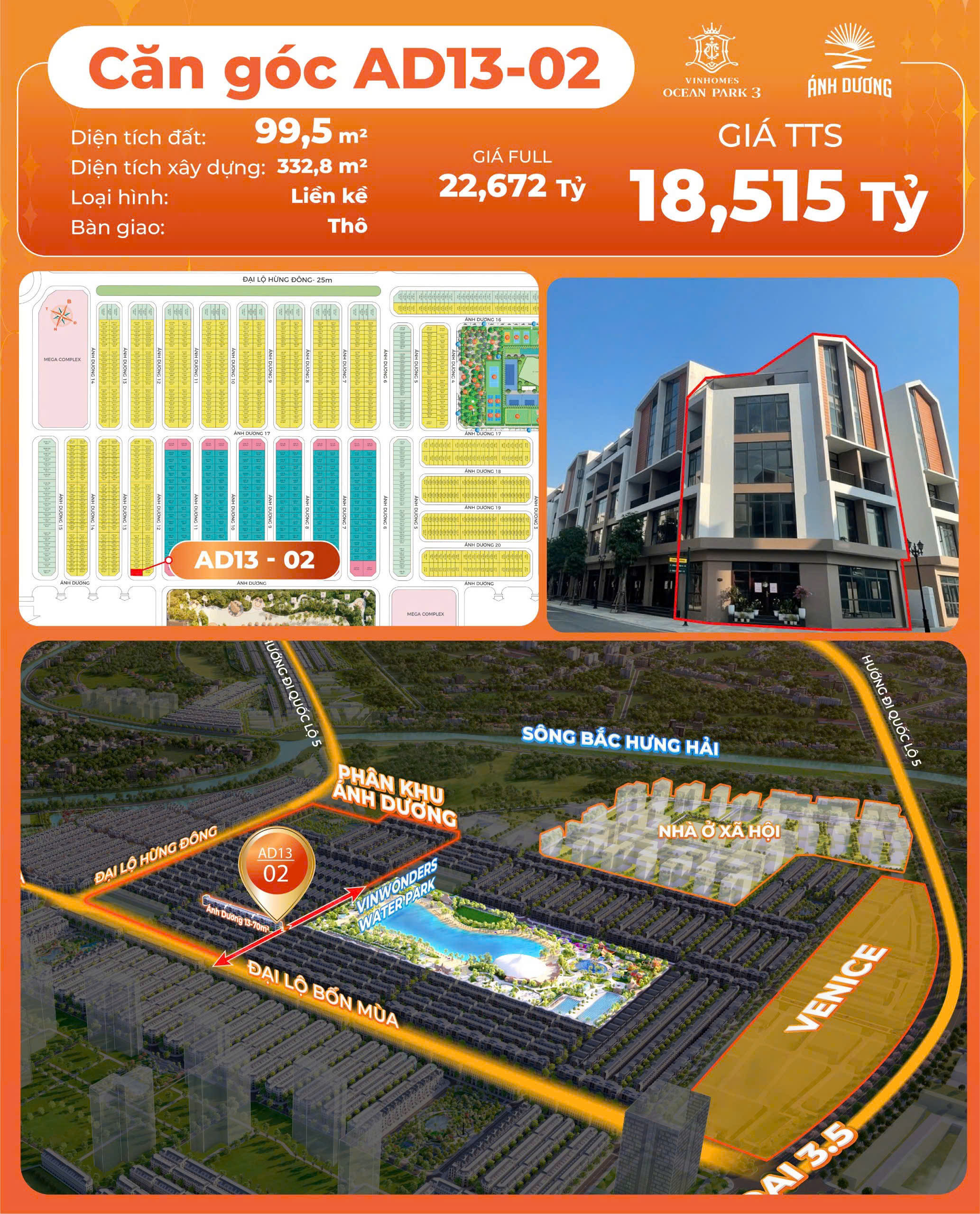 Sở hữu tọa độ giao thương sầm uất bậc nhất dự án với các dãy phố thương mại phong cách kiến trúc Hà Lan lần đầu tiên xuất hiện tại các đô thị Vinhomes. Cảnh quan sinh thái nội khu độc đáo, quy tụ bộ ba điểm đến sôi động: Công viên biển Beach Garden, Công viên sóng biển Waverly Garden và Công viên hải đăng Light House.